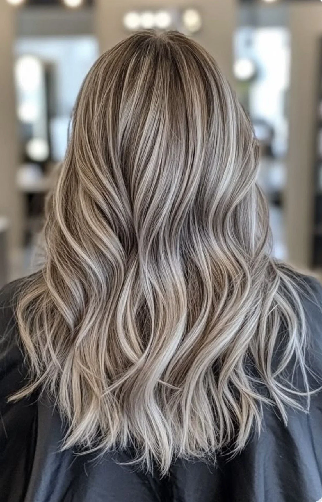 Highlights are applied to the entire head. Foils are spaced out to create contrast between the highlighted strands and the natural base color.